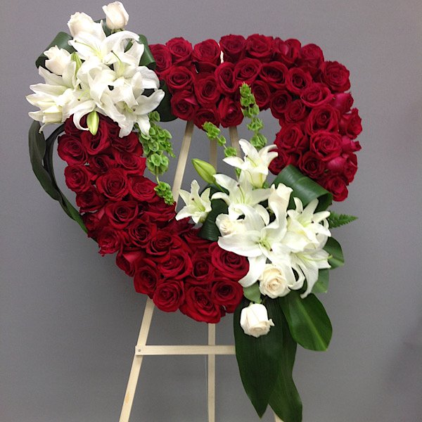 Show how much you care with a beautiful open heart standing spray with red roses, white roses and white lilies on both sides.