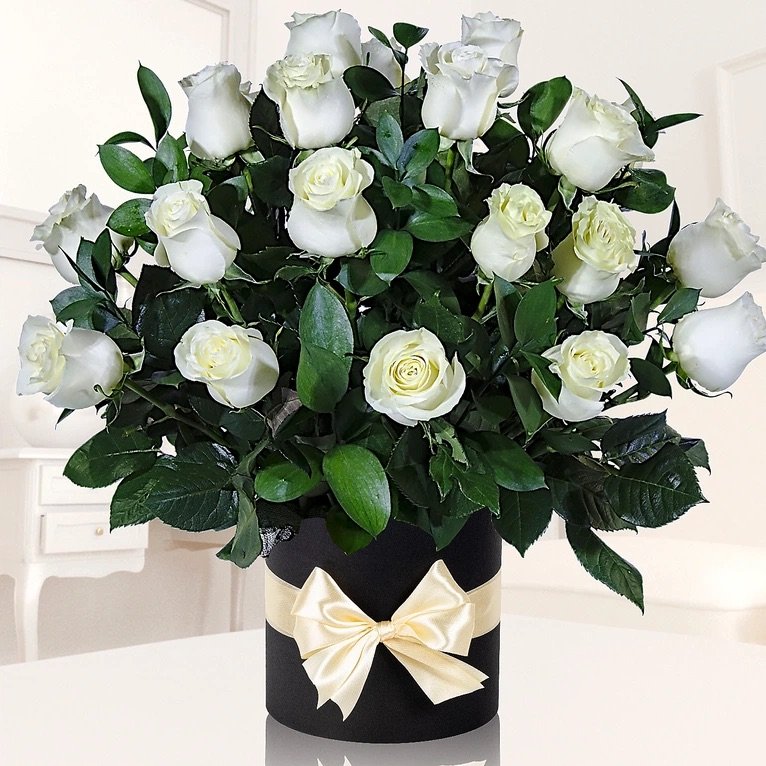 BEAUTIFUL WHITE LONG STEM ROSES VASED WITH LUSH FILLER AND GREENS AND A PRETTY RIBBON TO MATCH