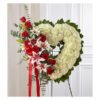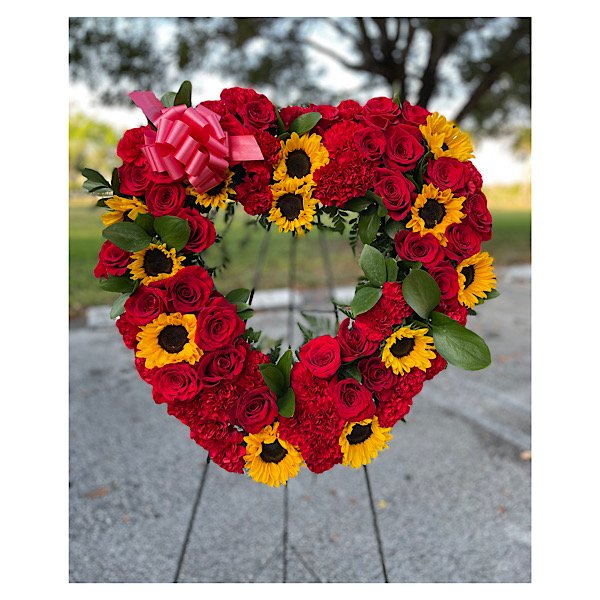 Show your deepest condolences with a beautiful bouquet of open heart with red roses and sunflowers.
