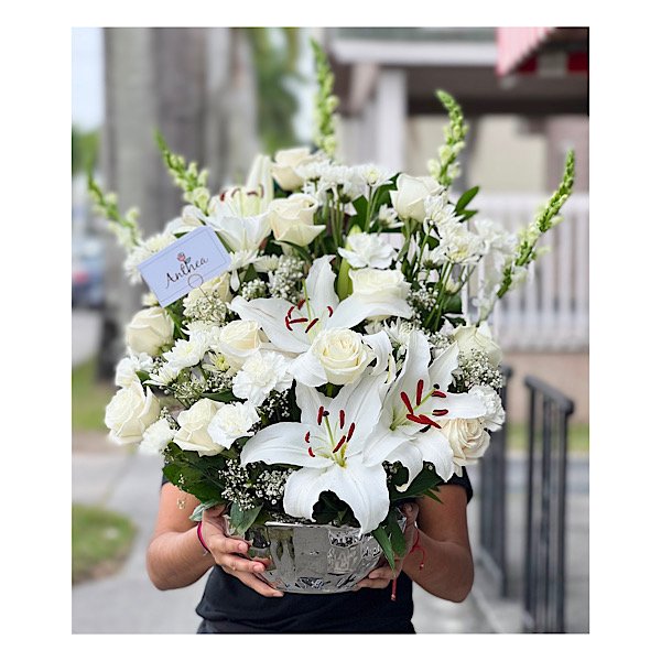This serene floral arrangement is the maximum expression of purity, innocence and delicacy. That is why it is a wonderful gift for a memorial service, confirmation, first communion, baptism or wedding.