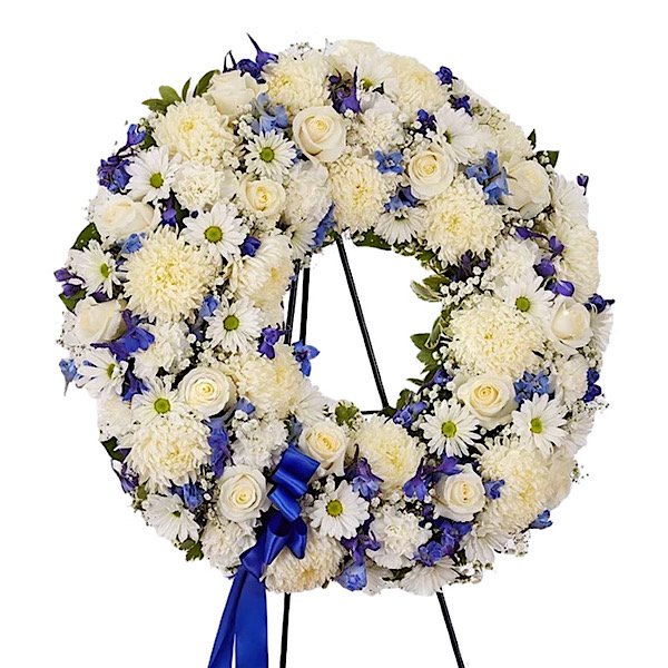 Referring to the beautiful, light, greenish-blue color, this name oozes calm. Show you love and sympathy with this enchanting wreath. It will typically contain flowers like roses, iris, chrysanthemum and seasonal greenery.