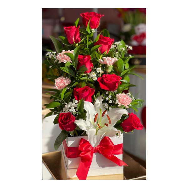 This amazing and lovely arrangement can totally fulfill your recipients heart with a beautiful mix of roses, carnations and a wonderful lily. Feel free to add our customizable balloons and chocolate dipped strawberries.